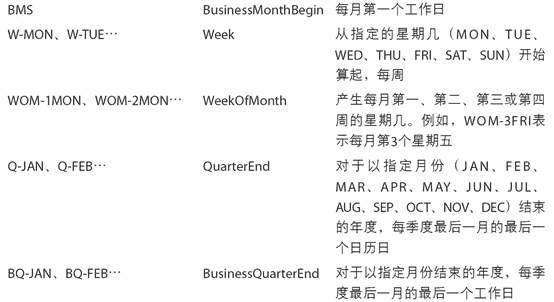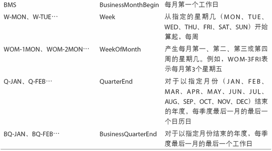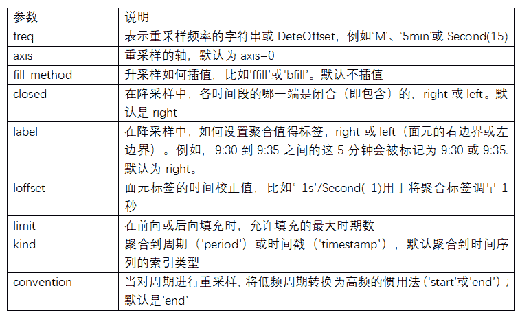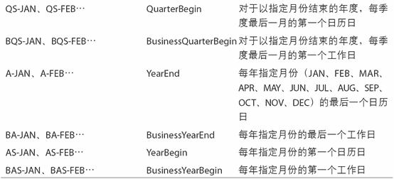 如果不满足这些条件,就会引发异常。这主要影响的是按季、年、周计算的频率。例如,由Q-MAR定义的时间区间只能升采样为A-MAR、A-JUN、A-SEP、A-DEC等: